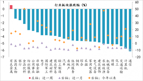 行业表现:近一周除有色金属板块略涨0.58%外,其余行业板块全线下行。