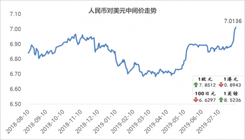 人民币汇率:受多重因素影响,人民币汇率贬值,美元兑人民币突破7元关口。近一周人民币对美元汇率中间价上调1140个基点至7.0136。