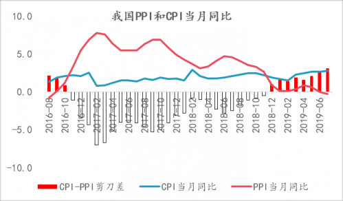 2019年7月,我国CPI当月同比增速较前期小幅上行0.1个百分点至2.8%,PPI当月同比增速转负为-0.3%,增速连续3个月下行;CPI与PPI剪刀差走扩。