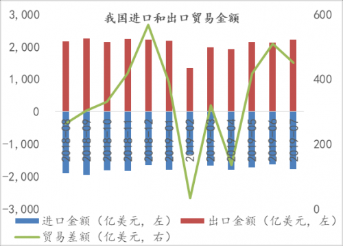 2019年7月,我国出口同比增速由负转正为3.3%,进口同比增速小幅回升至-5.6%,进口和出口增速依旧维持低位;贸易顺差小幅收窄至451亿美元。