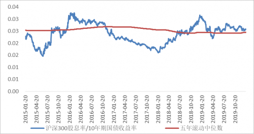 图表 3 股债相对价值:从沪深 300 股息率/10 年期国债收益率来看,股债性价比在 5 年滚动中位数上方,估值角度对股市相对有利且本期股相对债的优势略有上升。