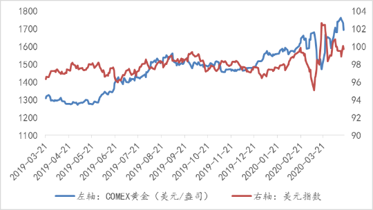 图表 9 黄金和美元指数走势:特朗普宣布“重启美国”计划,市场对美元需求不减,近一周美元指数上涨0.2%,收于99.72;COMEX黄金价格下跌2.65%。