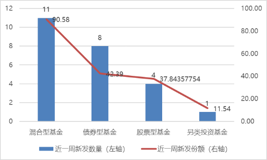 上周共有24只基金公告成立(主代码口径统计,下同),其中股混型基金共计新发份额128.42亿份,正在发行的基金中包括5只新三板基金。