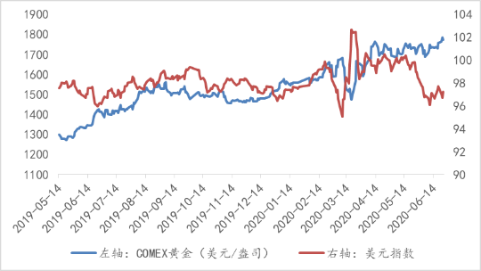 图表 9 黄金和美元指数走势:受疫情二次蔓延及地缘局势的影响,避险情绪再次升温。节前三个工作日COMEX黄金价格探底回升,上涨0.89%;美元指数下跌0.47%,收于97.23。