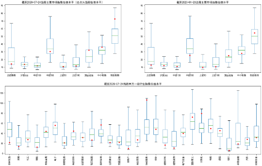 图表 6 主要市场指数及行业指数估值PE(TTM)箱体图:本周各指数估值均下降:创业板指估值百分位最高,达92.88%,其次是深证成指;当前,上证综指、上证180、中证500估值百分位最低。行业层面,处于历史分位数最高的前三行业分别是休闲服务、计算机、医药生物,处于历史分位数最低的是农林牧渔、房地产、建筑装饰。