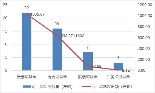 上周共有48只基金公告成立(主代码口径统计,下同),其中债券型基金共计新发份额1035.67亿份。