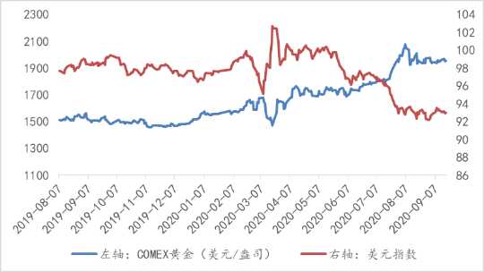 图表 9 黄金和美元指数走势:美国经济数据表现依然较差、法国新冠疫情持续恶化等因素支撑金价,近一周COMEX黄金价格震荡上涨0.46%。美元指数冲高回落,全周下跌0.26%,收于93.01。