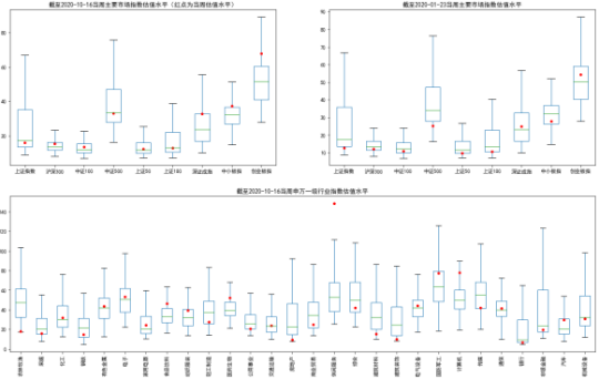 图表 6 主要市场指数及行业指数估值PE(TTM)箱体图:上周各指数估值整体上升:创业板指估值百分位最高,达88.16%,其次是中小板指;当前,上证综指、中证500、上证180估值百分位最低。行业层面,处于历史分位数最高的前三行业分别是休闲服务、计算机、食品饮料,处于历史分位数最低的是农林牧渔、房地产、建筑装饰。