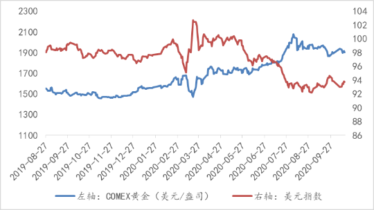 图表 9 黄金和美元指数走势:由于美国刺激计划不确定性较强,黄金价格受到美元流动性偏紧影响,价格反弹承压。近一周COMEX黄金价格下跌1.72%;美元指数近一周上涨0.75%,收于93.71。