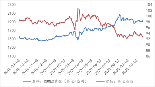 图表 9 黄金和美元指数走势:由于美国刺激经济计划迟迟不能落地,近一周COMEX黄金价格先涨后跌,全周小幅上涨0.03%;美元指数近一周下跌1.03%,收于92.74。