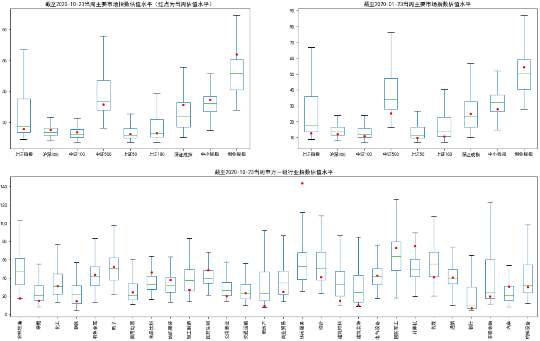 图表 6 主要市场指数及行业指数估值PE(TTM)箱体图:上周各指数估值整体下降:创业板指估值百分位最高,达81.61%,其次是深证成指;当前,上证综指、中证500、上证180估值百分位最低。行业层面,处于历史分位数最高的前三行业分别是休闲服务、计算机、食品饮料,处于历史分位数最低的是农林牧渔、房地产、建筑装饰。