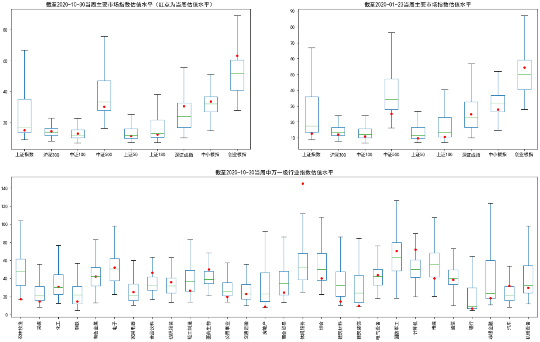图表 6 主要市场指数及行业指数估值PE(TTM)箱体图:上周各指数估值整体下降:创业板指估值百分位最高,达80.90%,其次是深证成指;当前,上证综指、中证500、上证180估值百分位最低。行业层面,处于历史分位数最高的前三行业分别是休闲服务、计算机、食品饮料,处于历史分位数最低的是农林牧渔、房地产、建筑装饰。