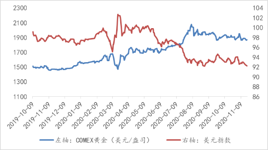 图表 9 黄金和美元指数走势:新冠疫苗研发取得进展提振市场对经济反弹乐观预期,近一周COMEX黄金价格下跌0.99%,美元指数下跌0.77%,收于92.26。