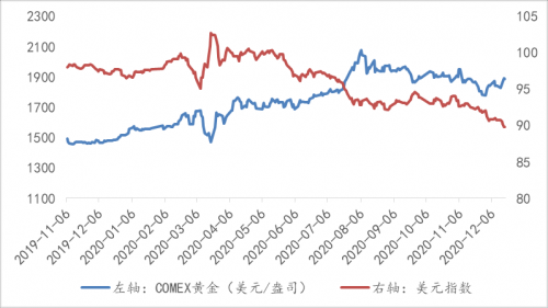 图表 9 黄金和美元指数走势:美国国会更加接近就财政刺激方案达成一致打压美元,对金价构成支撑,近一周COMEX黄金价格上涨2.35%;美元指数下跌1.03%,收于89.84。