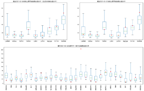 图表6 主要市场指数及行业指数估值PE(TTM)箱体图:上周各指数估值整体下跌:创业板指估值百分位最高,达87.66%,其次是沪深300;当前,中证500、上证综指、上证180估值百分位最低。行业层面,处于历史分位数最高的前三行业分别是休闲服务、食品饮料、计算机,处于历史分位数最低的是建筑装饰、农林牧渔、房地产。