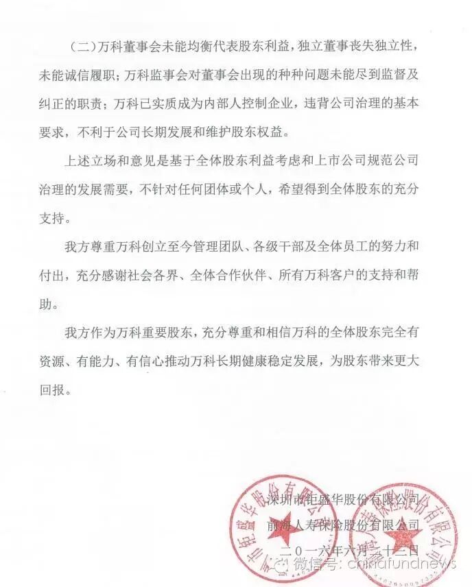 两家公司称,万科董事会未能均衡代表股东利益,独立董事丧失独立性,未能诚信履职;万科监事会对董事会出现的种种问题未能尽到监督及纠正的职责;万科已实质成为内部人控制的企业,违背公司治理的基本要求,不利于公司长期发展和维护股东权益。